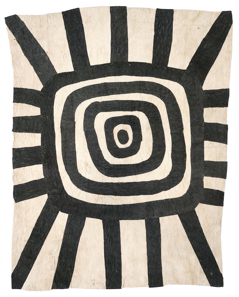 sihoti’e taliobamë’e - appliquéd, mud-dyed and hand-beaten nioge (barkcloth) hand-stitched with locally harvested river reed thread using a bat wing bone needle