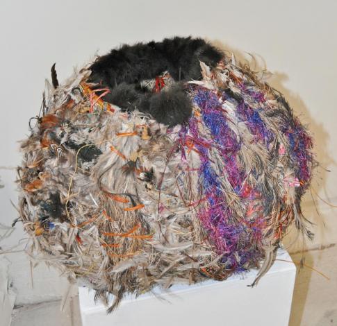 tjanpi, wool, raffia, emu feathers, wire, fur trim